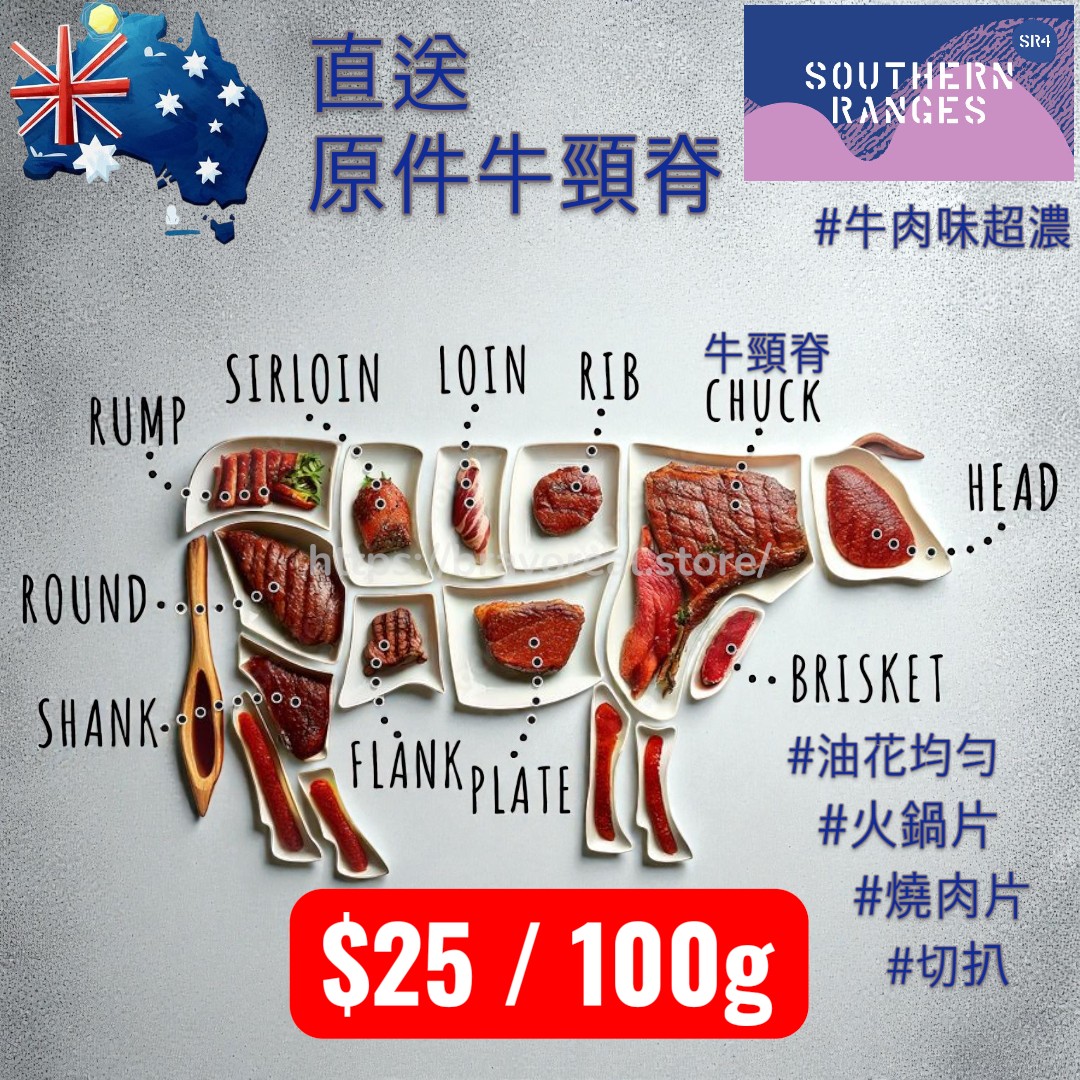 澳洲 ▪︎ Southern Rangers 直送 ▪︎ 安格斯 ▪︎ 原件 牛頸脊 [ 530g +/- ] 澳洲 Southern Rangers 直送、未經切割、完整安格斯牛頸脊肉。Southern Rangers農場業內有一定聲譽,專注高品質安格斯牛肉,經過嚴格篩選有品質保證。牛頸脊是牛頸部到肩胛骨之間,因經常活動,所以肉質結實,脂肪含量適中,油花分布均勻,肉質口感軟嫩牛味濃 店長建議: # 燒烤:厚切 ,牛味濃多汁 # 火鍋: 火鍋切片 # 香煎: 切扒 (2-3cm厚),口感軟嫩